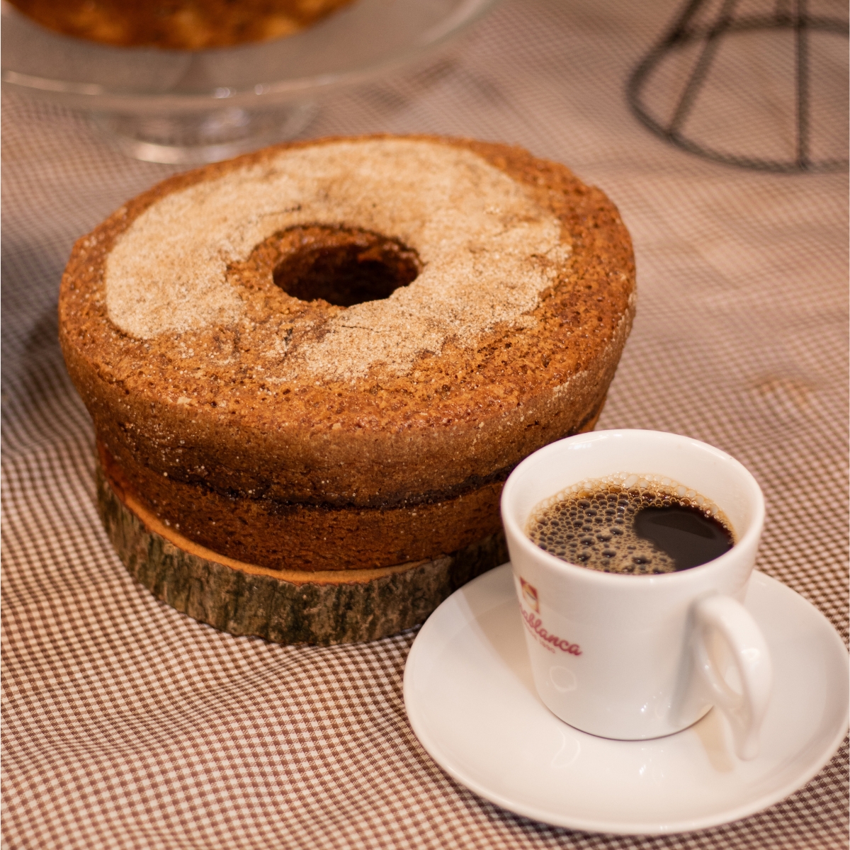 Bolo de trigo com toque de Leite em pó na massa e uma casquinha crocante por cima.